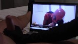 Handjob in gloves, while i'm watching one of my wife vids, with cumshot