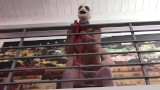 Bound to a railing in fishnet pantyhose and heels you can see her tits and ass while I use her holes