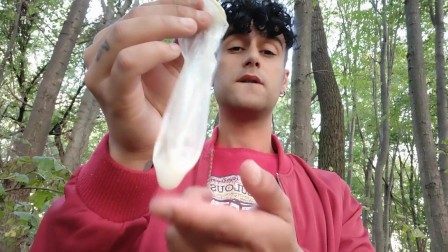 Playing with cruiser´s used condom in mouth and eating his cum after cruising