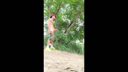 Long distance cumshot outdoor