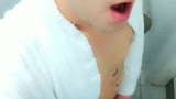Jerk off at spa toilet in bathrobe before the pool