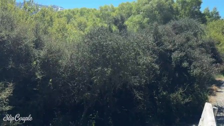 Public and risky, sloppy handjob on a bench during hiking